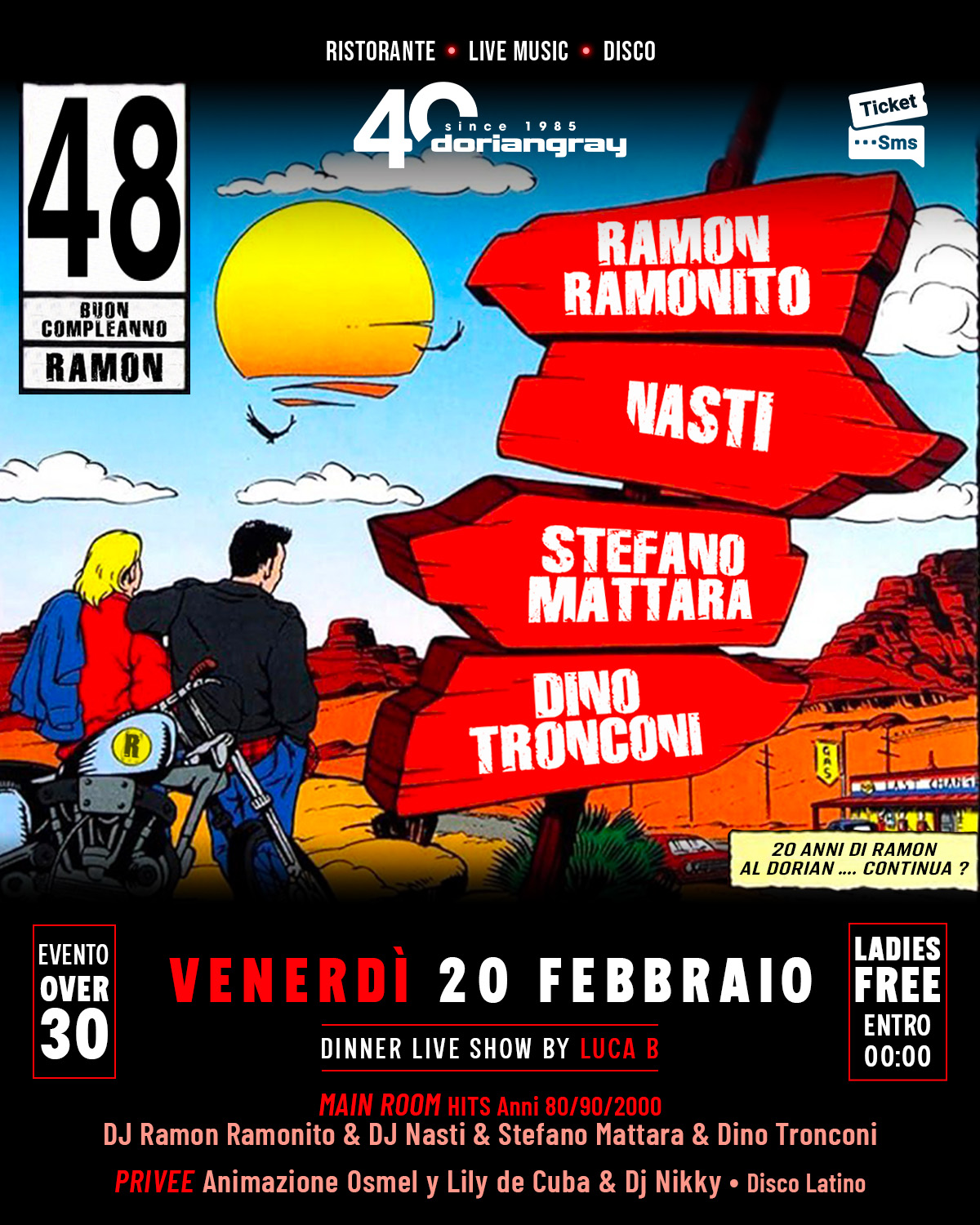 🎉 VENT’ANNI DI STRADA. STESSA DIREZIONE. 🎉 Una moto ferma, il cartello davanti e una domanda che vale una notte intera. Venti anni di Ramon al Dorian e sì, la VEDI |