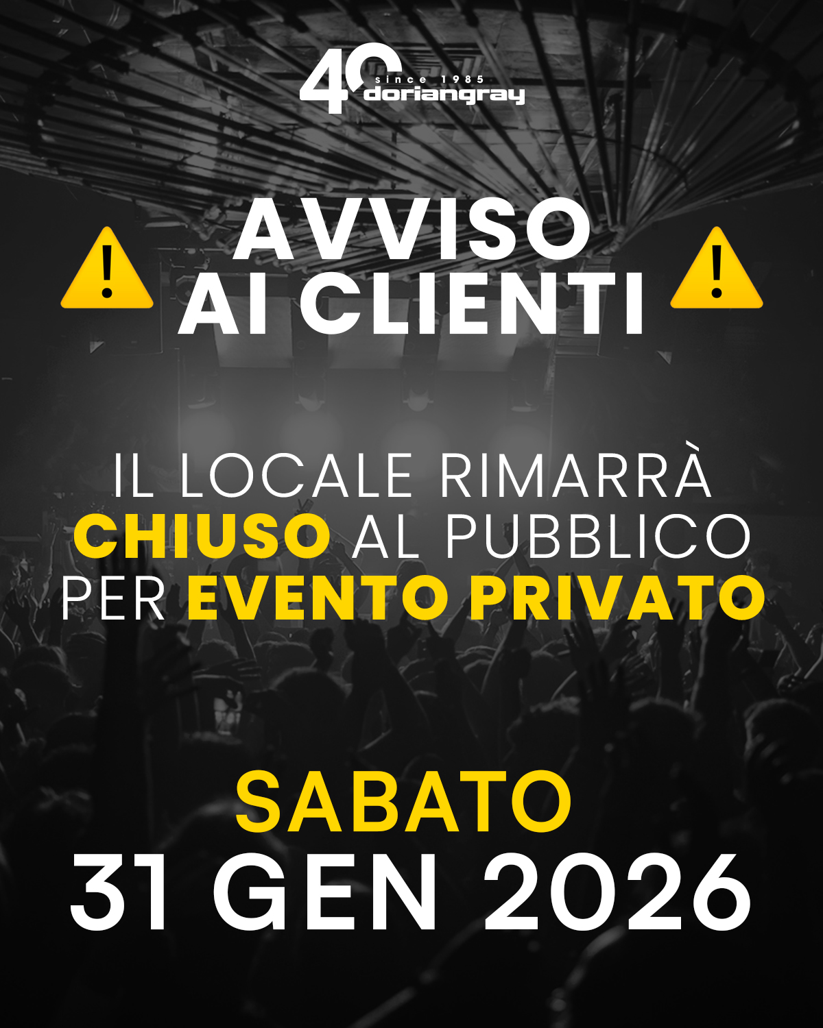 📢 AVVISO AI CLIENTI Sabato 31 gennaio 2026 il Dorian Gray resterà chiuso al pubblico. La serata sarà dedicata a un evento privato. Ci rivediamo dal prossimo appuntamento con la VEDI |