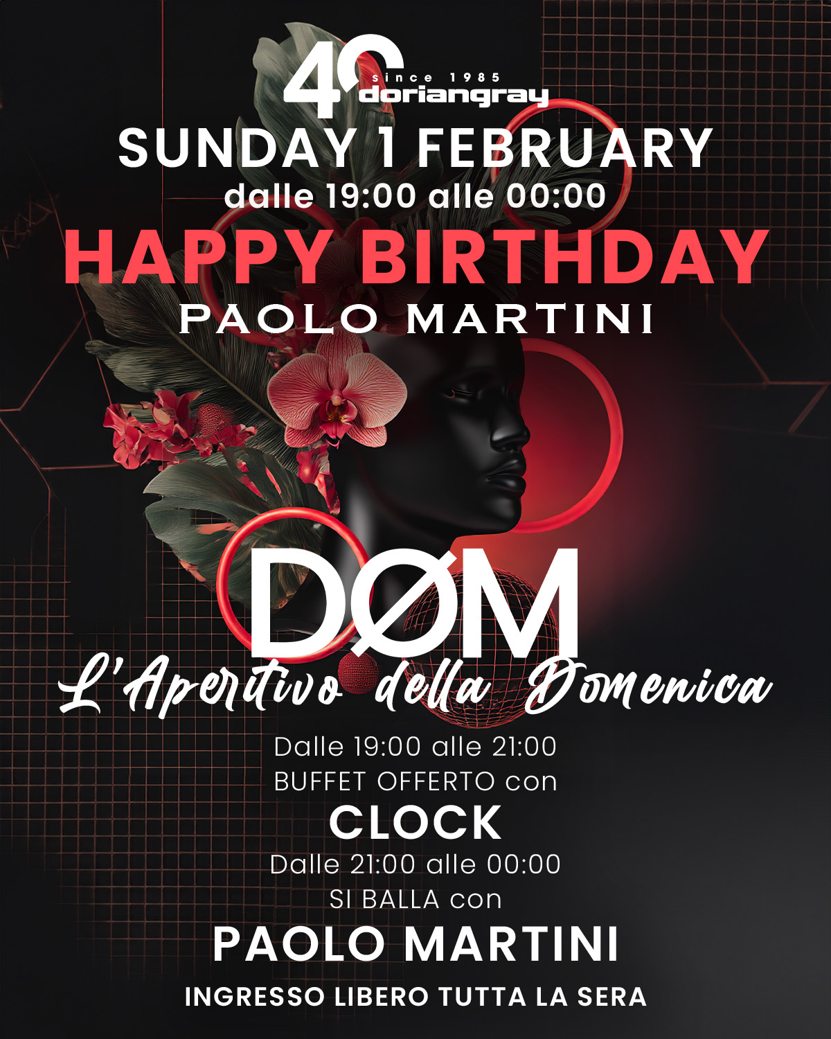 🎂🔥 Questa domenica si festeggia sul serio. DØM diventa una notte speciale per il compleanno di Paolo Martini. Dalle 19:00 si parte con aperitivo e buffet insieme a Clock, poi VEDI