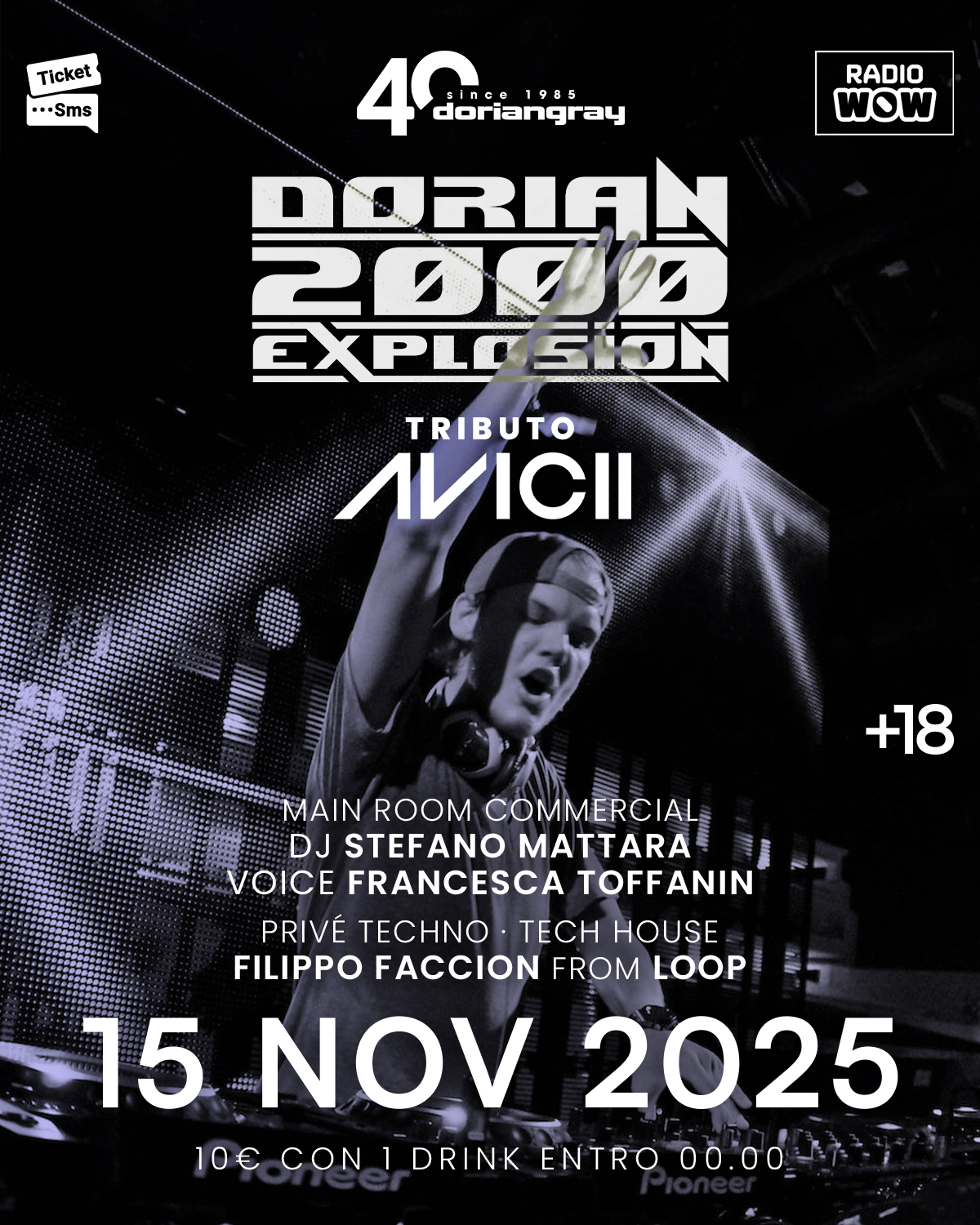 ⚡ DORIAN 2000 EXPLOSION - TRIBUTO AD AVICII ⚡ 📅 Sabato 15 Novembre 2025 📅 Un viaggio nel tempo, tra le hit che hanno fatto ballare un’intera generazione. Al Dorian VEDI |